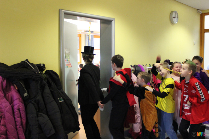 Kurz vor der großen Pause starteten die 3. und 4. Klässler eine lautstarke und fröhliche Polonaise durch das ganze Selmi-Gebäude. Auch sie durften anschließend in die Turnhalle zur Zauberin.