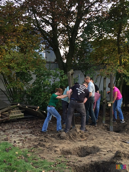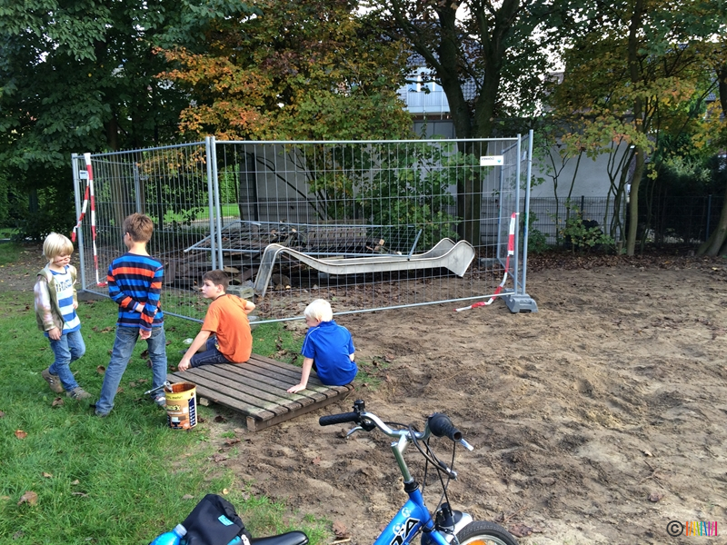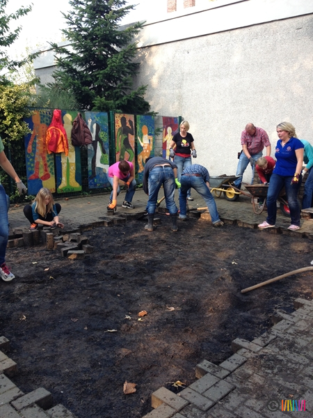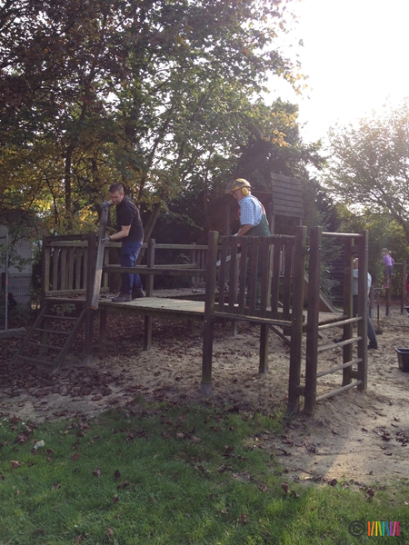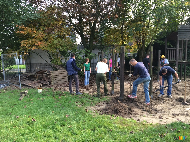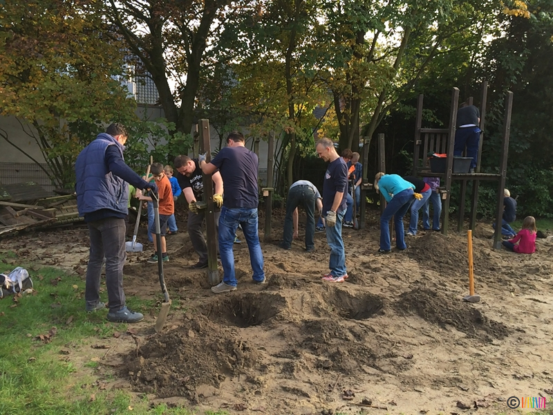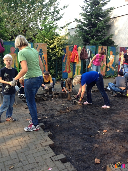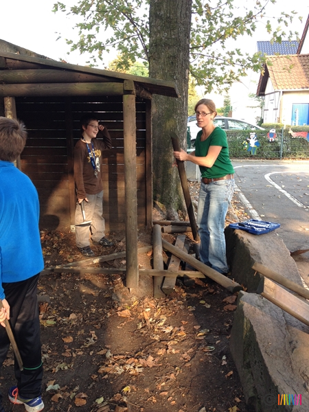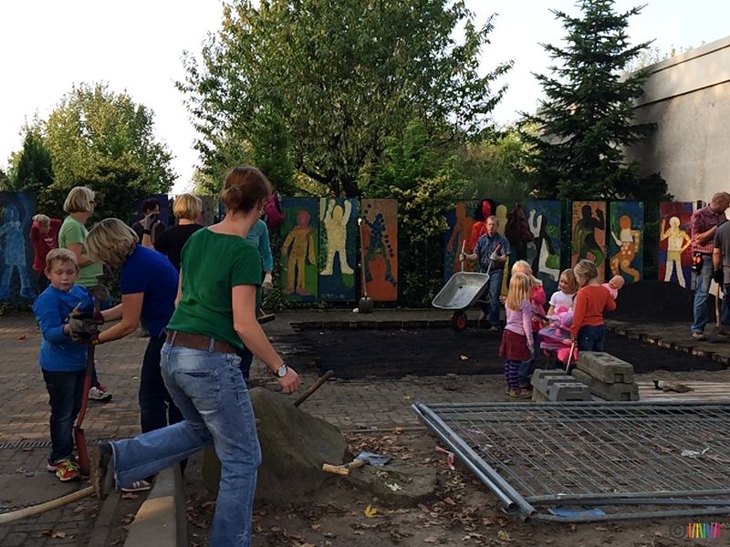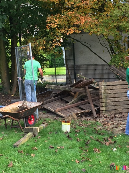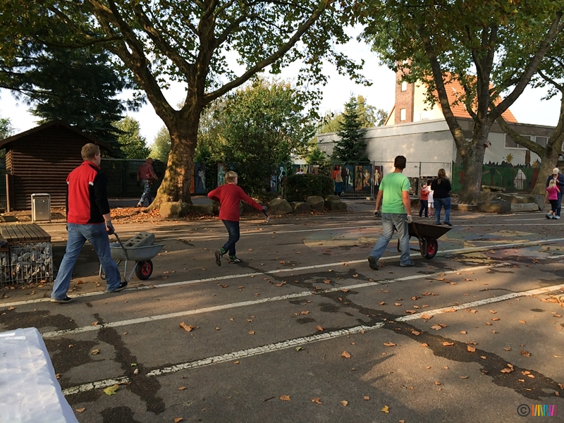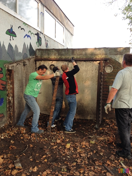 30.09.2014 - Unser Schulhof soll schöner werden! Dies gehört in diesem Jahr unter anderem zu unseren Zielen, die wir Hand in Hand mit unseren Kindern, Eltern und mit Unterstützung des Fördervereins in Angriff nehmen. Aber um neuen Spielraum und Platz zu schaffen, muss Altes zunächst einmal verschwinden. Hierfür erklärten sich einige Eltern unserer Kinder bereit und „feierten“ am 30.09. eine 'Abrissparty'.
