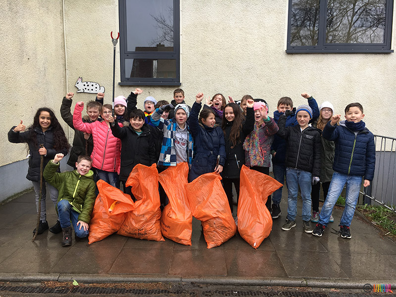 15.03.2019 - Bei trübem Wetter fand am Freitag unsere diesjährige Müllsammelaktion statt. Die Viertklässler befreiten mit Freude und Eifer die Natur von gedankenlos weggeworfenem Müll. Mit Handschuhen, Pickzangen und Müllsäcken durchkämmten die Kinder Sträucher und Gebüsche, rund um unsere Selmigerheideschule.