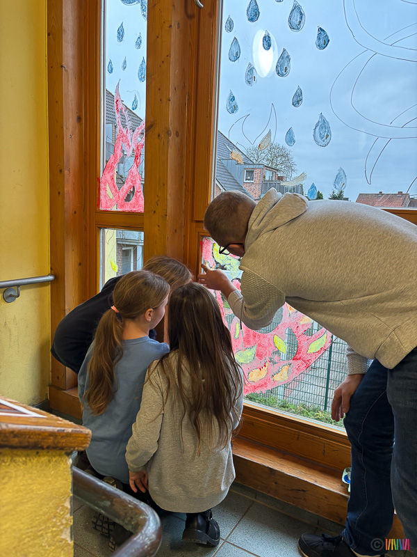Am vierstündigen Basteltag wurden verschiedene Techniken und Materialien eingesetzt, um die unterschiedlichen Elemente lebendig werden zu lassen. Die Kinder malten, bastelten und gestalteten mit viel Begeisterung und Kreativität. Die Fenster der Schule wurden mit bunten Bildern und Collagen geschmückt, die die Schönheit und Vielfalt der Elemente widerspiegeln. Dieser Kunstprojekttag diente nicht nur der Verschönerung des Schulgebäudes, sondern auch der Vorbereitung auf das bevorstehende Schulfest am 24. Mai 2025. Die Selmigerheidegrundschule erstrahlt nun in bunten Farben und freut sich auf das kommende Schulfest!